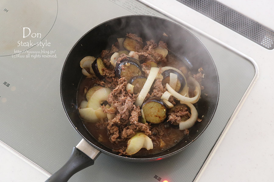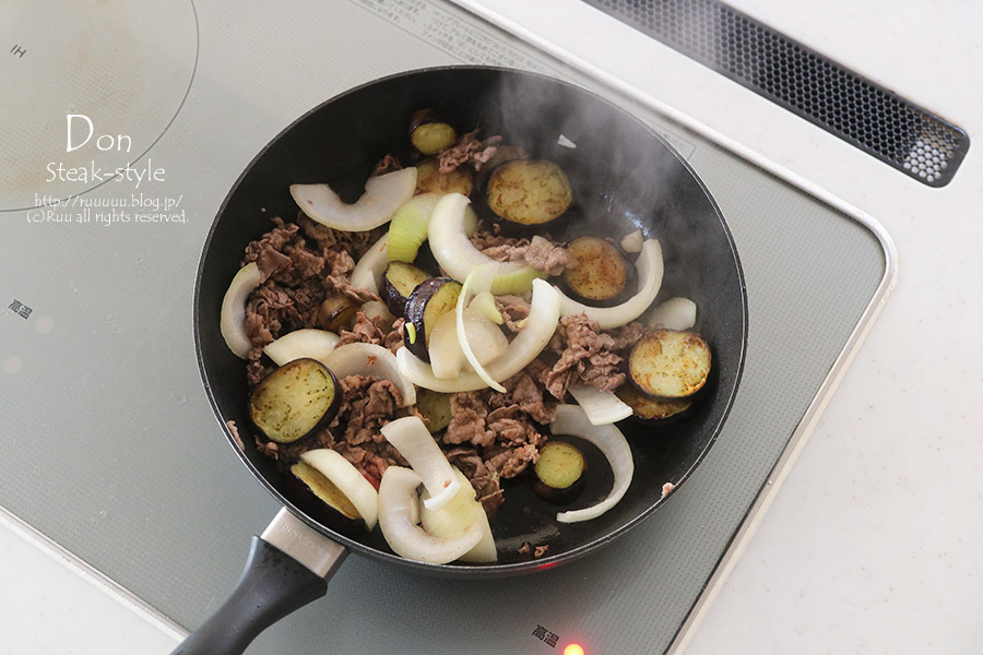 牛小間と茄子のステーキ風丼できあがり。