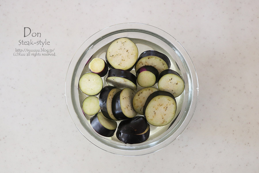 1:茄子は厚さ1.5cmくらいの輪切りにし、水にさらしてアクを抜き、水気を拭き取る。