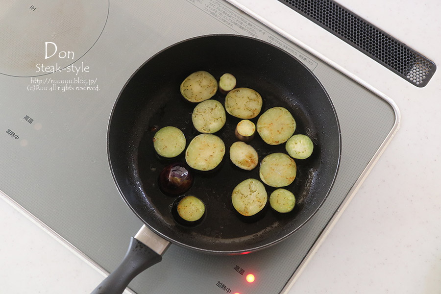 4:そのまま茄子を入れ、両面を焼く。
