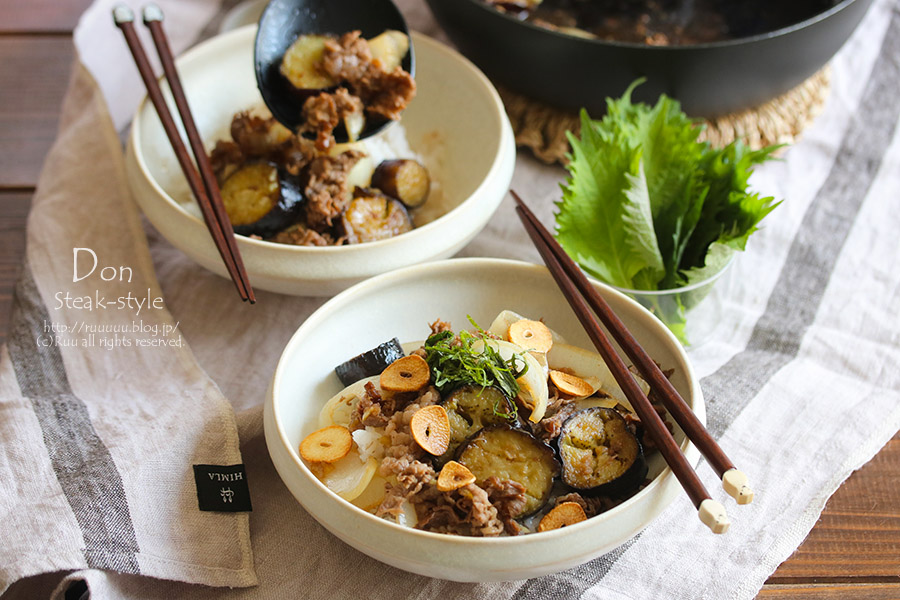 牛小間と茄子のステーキ風丼。