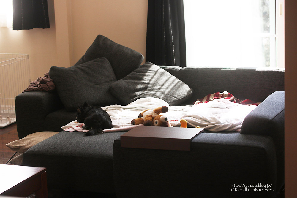 (分かりにくいんですが、中央よりやや左寄りにある黒い物体がタマの尻で、朝からずっとこのまんま。あと綺麗なほうです。今日のリビングはめっちゃ綺麗)