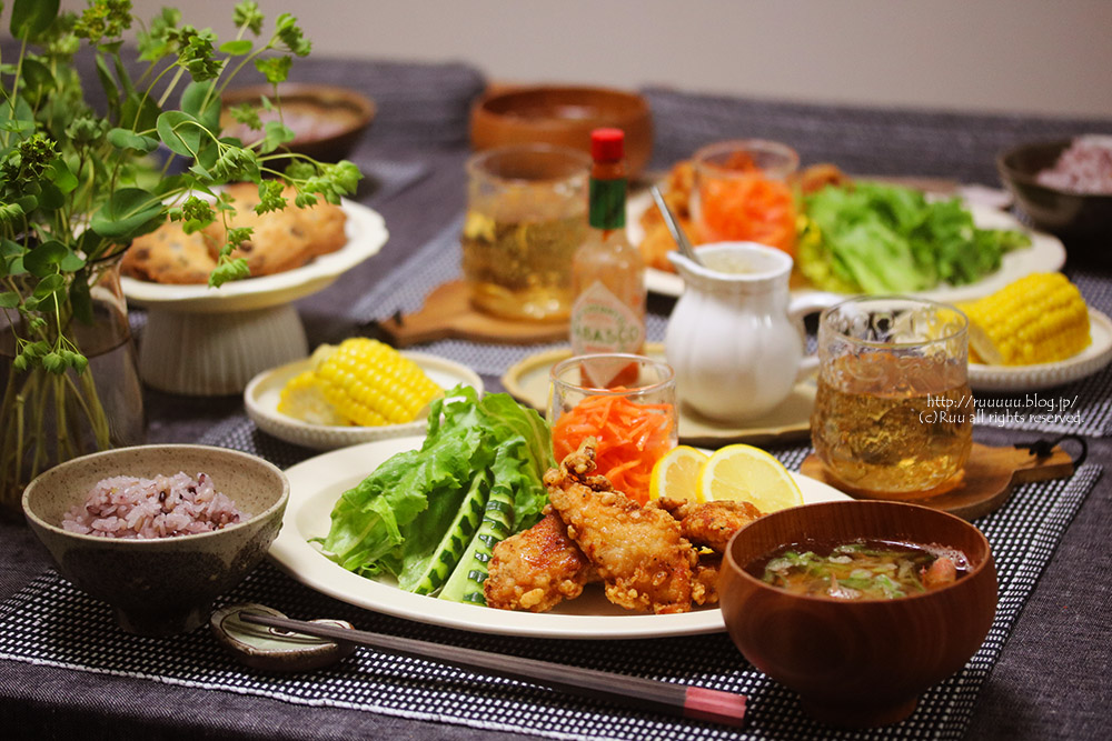 大人のから揚げ・キャロットラペ・甘海老の味噌汁・とうもろこし・一番娘作チョコチップクッキー