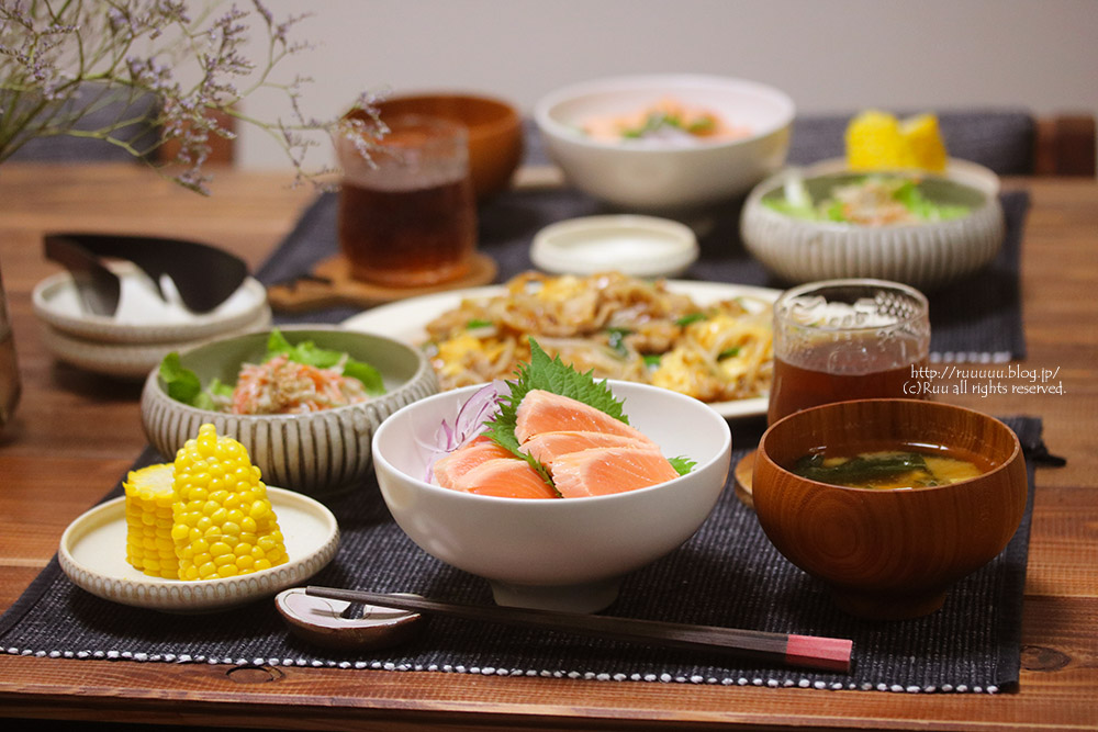 炙りサーモンの丼・ごぼうサラダ・もやしのあんかけ炒め・とうもろこし・豆腐とわかめの味噌汁
