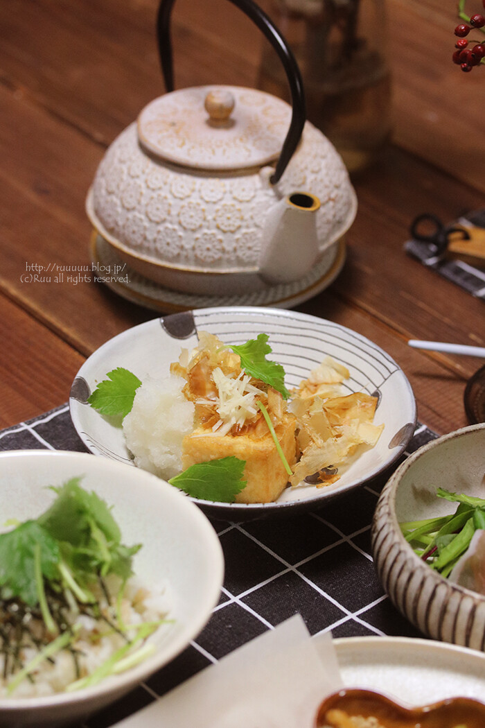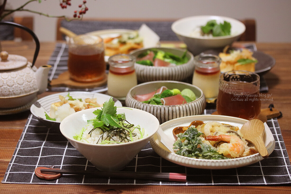 天茶漬け・焼き絹揚げ・生ハムサラダ・プリン