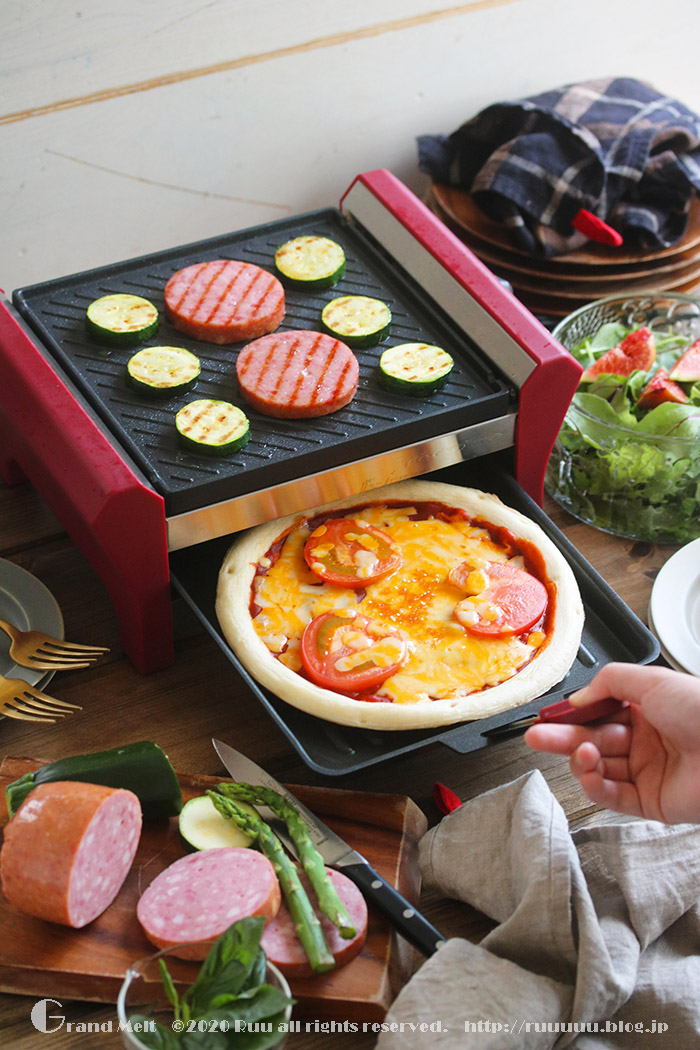 上段では具材を焼いて、下段ではピザを焼いて、