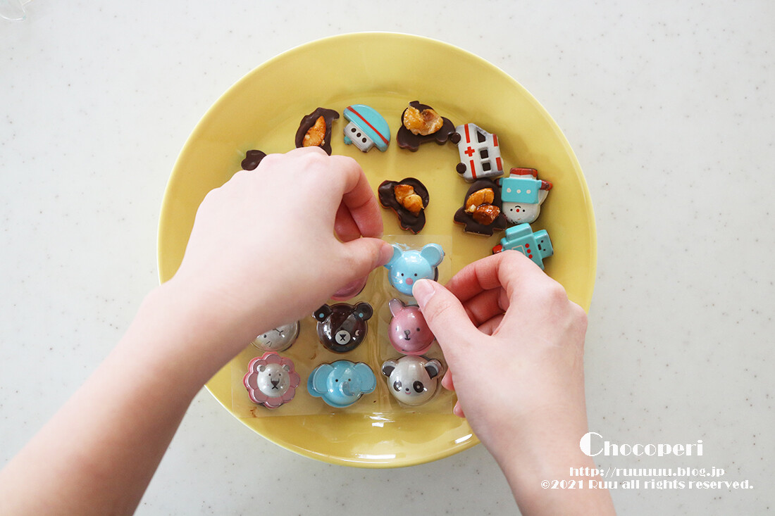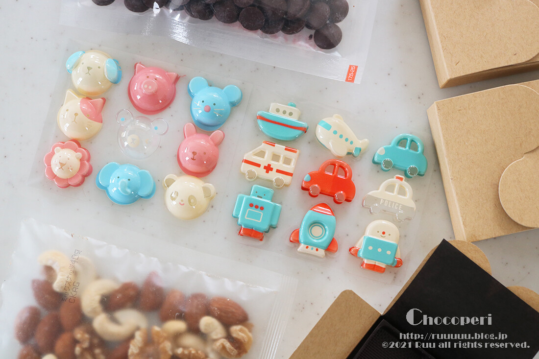 マンディアンが作れるキット(左)と、どうぶつ&ハートのチョコペリが作れるキット(中)と、どうぶつ&乗り物のチョコペリが作れるキット。