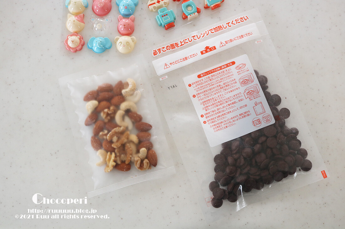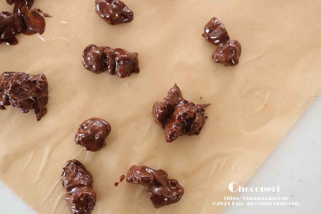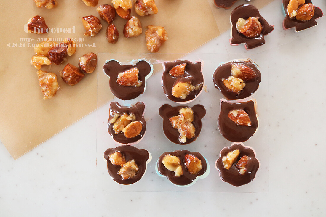 ナッツをのせすぎるとチョコレートが溢れるので、1~2粒くらいずつ様子をみながらのせる感じで。また、冷やす時間が足りないとチョコペリが綺麗にはがれないので、しっかり冷凍庫で冷やして。