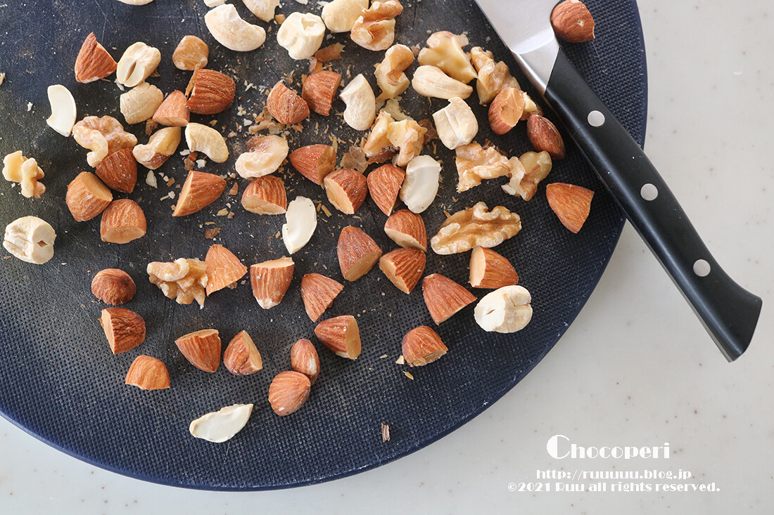 ナッツは、カシューナッツ、アーモンド、くるみのミックスタイプ。