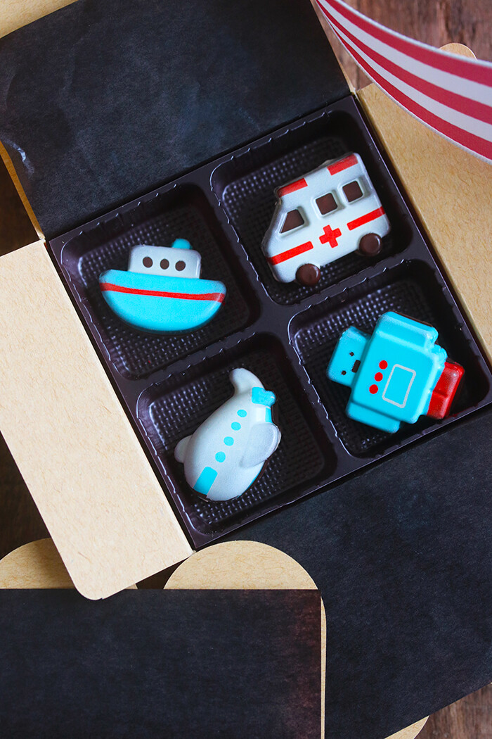 チョコレートモールドは、かわいい動物と乗り物たちが全18粒分。