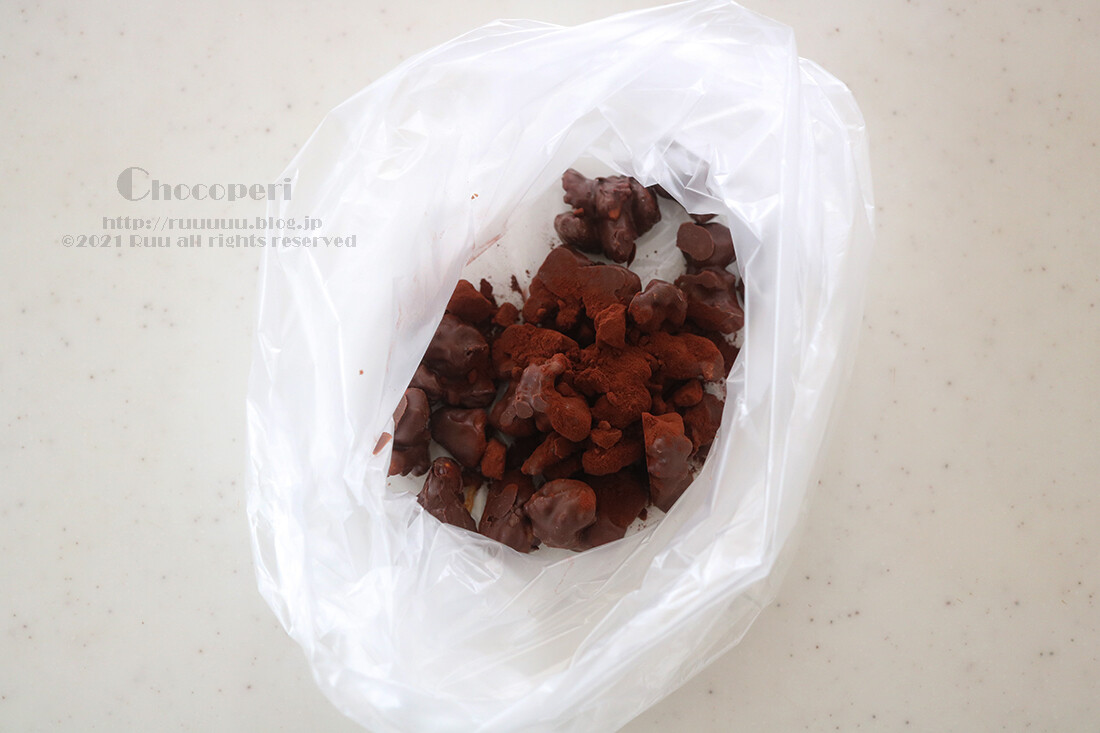 12:キャラメリゼショコラが固まったら、ポリ袋にココアパウダーとキャラメリゼショコラを入れ、袋の口を閉じて振る。