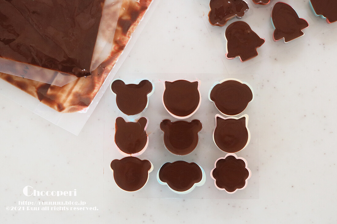 13:チョコペリが固まったら、手で軽く型を押し、型から外す。