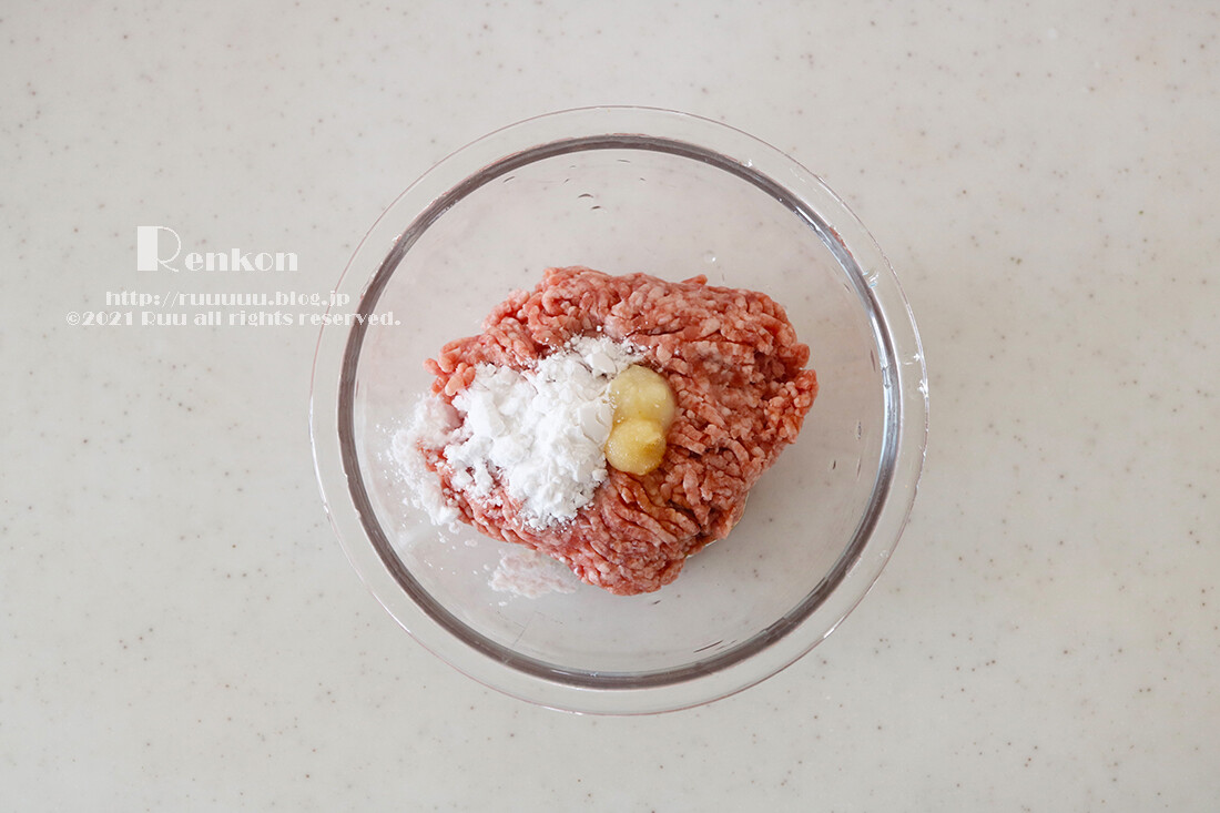 4:ボウルに豚ひき肉とAを入れ、手で混ぜる(肉ダネ完成)。