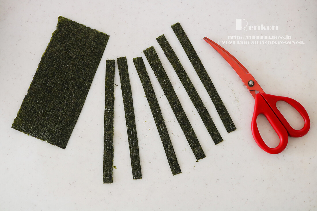 1:焼き海苔は1.5cm幅に切る(女性のひとさし指の幅がだいたい1.5cmくらいなので指の幅くらいの海苔を6本切ってください)。