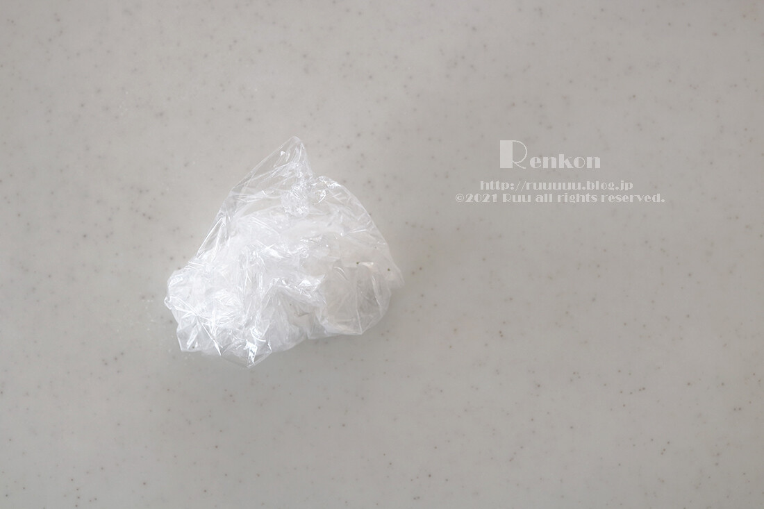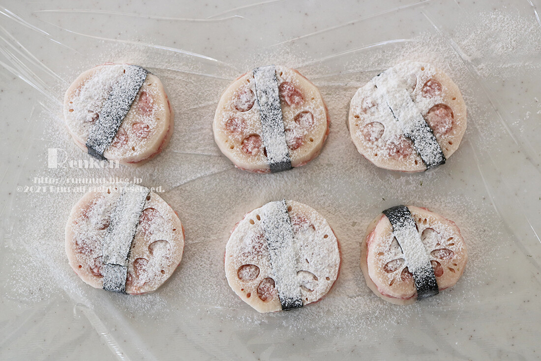 ■成形~粉をふるう時、キッチン台や皿にラップを敷き、その上にれんこんを置いておくと、後で捨てることができる=片付けが楽ちんです(粉のついたものは意外と洗いにくいのです)。