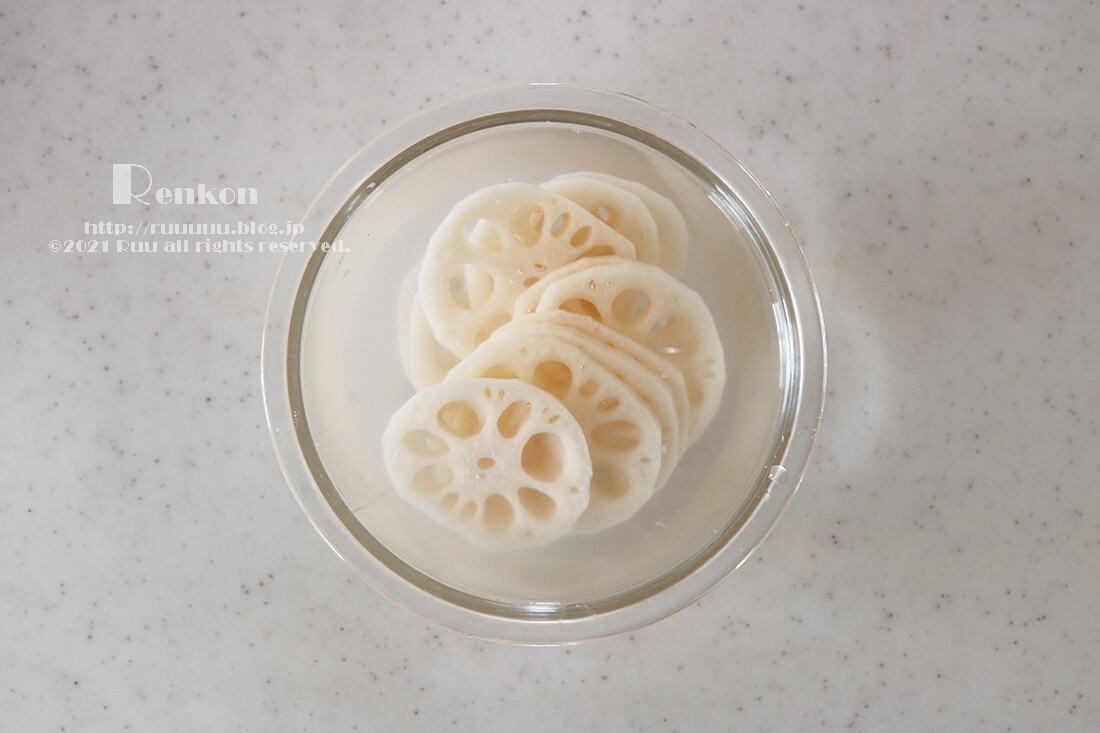 2:れんこんは皮をむき、厚さ5mm程度にスライスする。