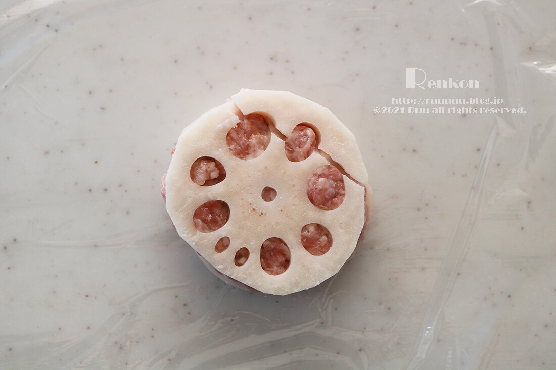 ■肉ダネを詰める時は、れんこんの穴から肉ダネがはみでるくらいぎゅうぎゅうに押すか、れんこんの穴にも肉ダネを詰めてください(そうすると加熱時にはがれにくい)。