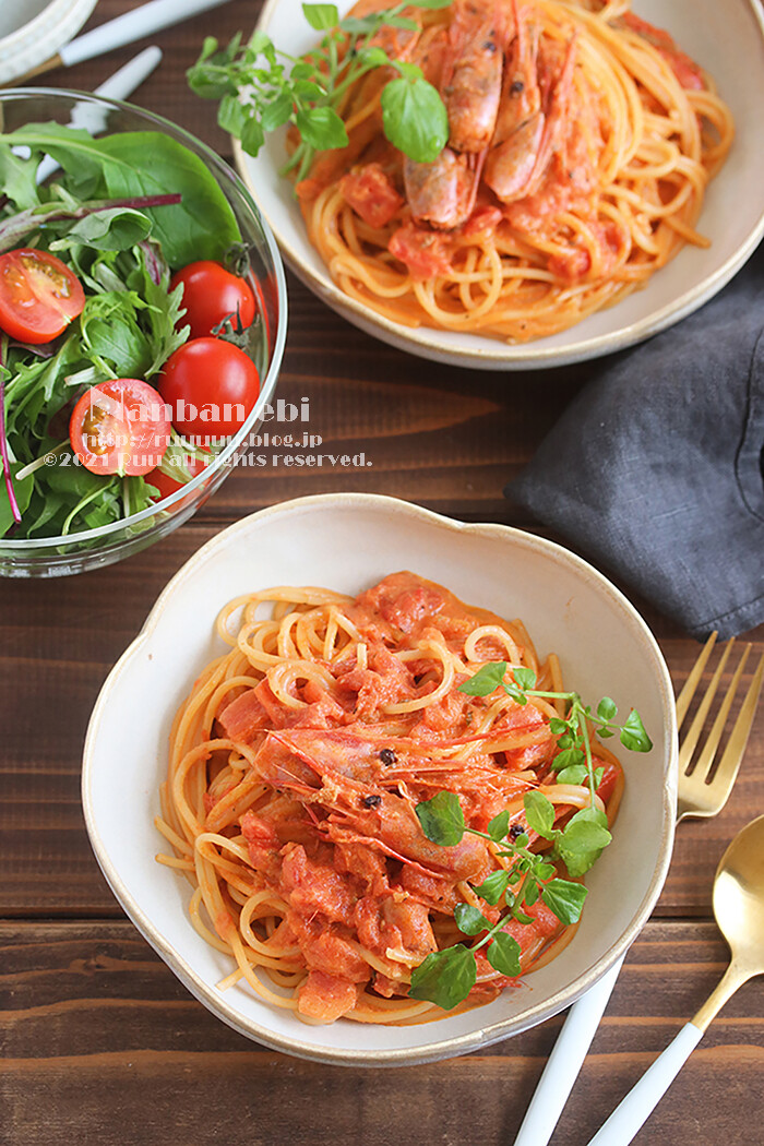 (トマトクリームパスタ&塩ユッケの材料に「南蛮海老」がでてきますが、