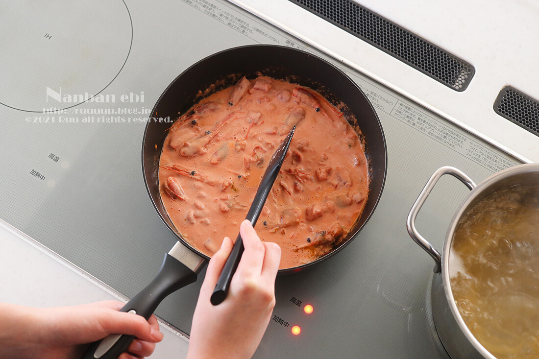 3:Bを入れ、海老の頭を潰しながら煮る。パスタが茹で上がる1~2分前に生クリームを加える。