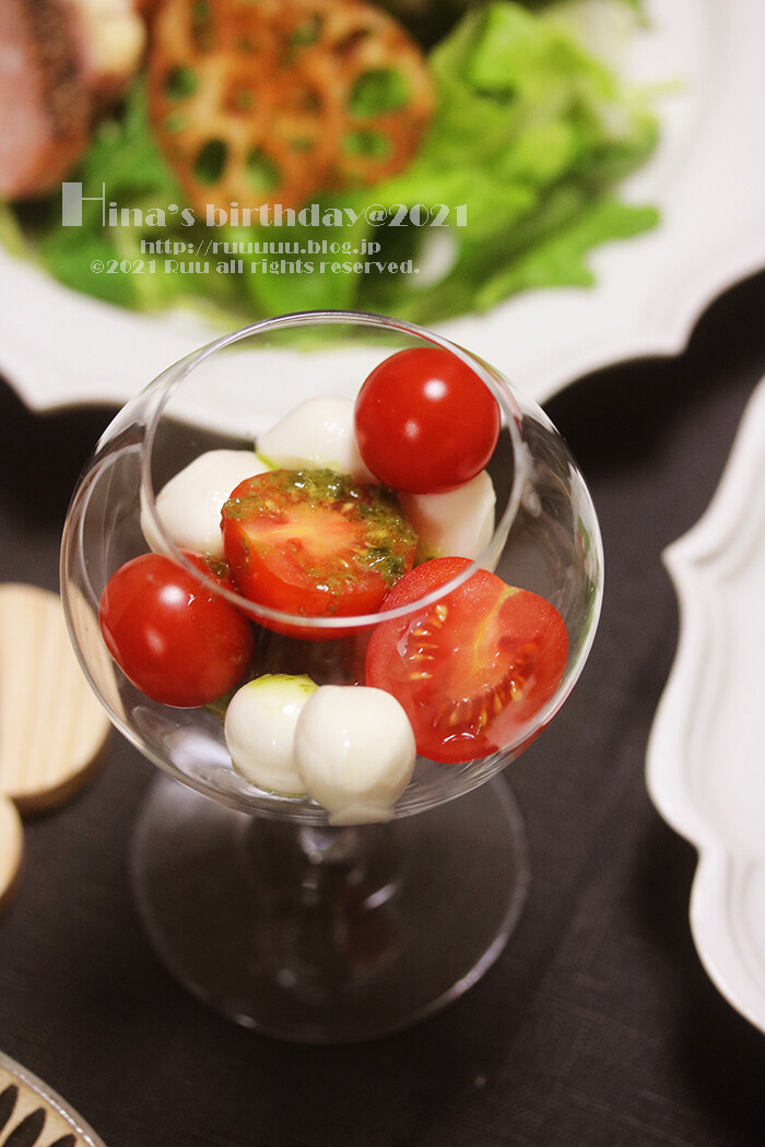 一番娘のだーーーーい好きなモッツアレラチーズとミニトマトをジェノベーゼソースで和えたミニカプレーゼ。