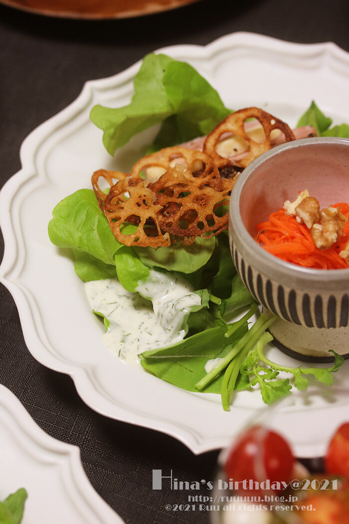 一番娘の大好きなれんこんチップスをのせて、ついでにキャロットラペも添えた盛り合わせサラダ。