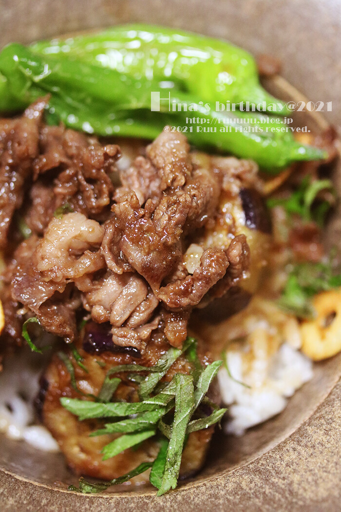 そんなええお肉(の、切り落とし)をふんだんに使った茄子のステーキ風丼は。