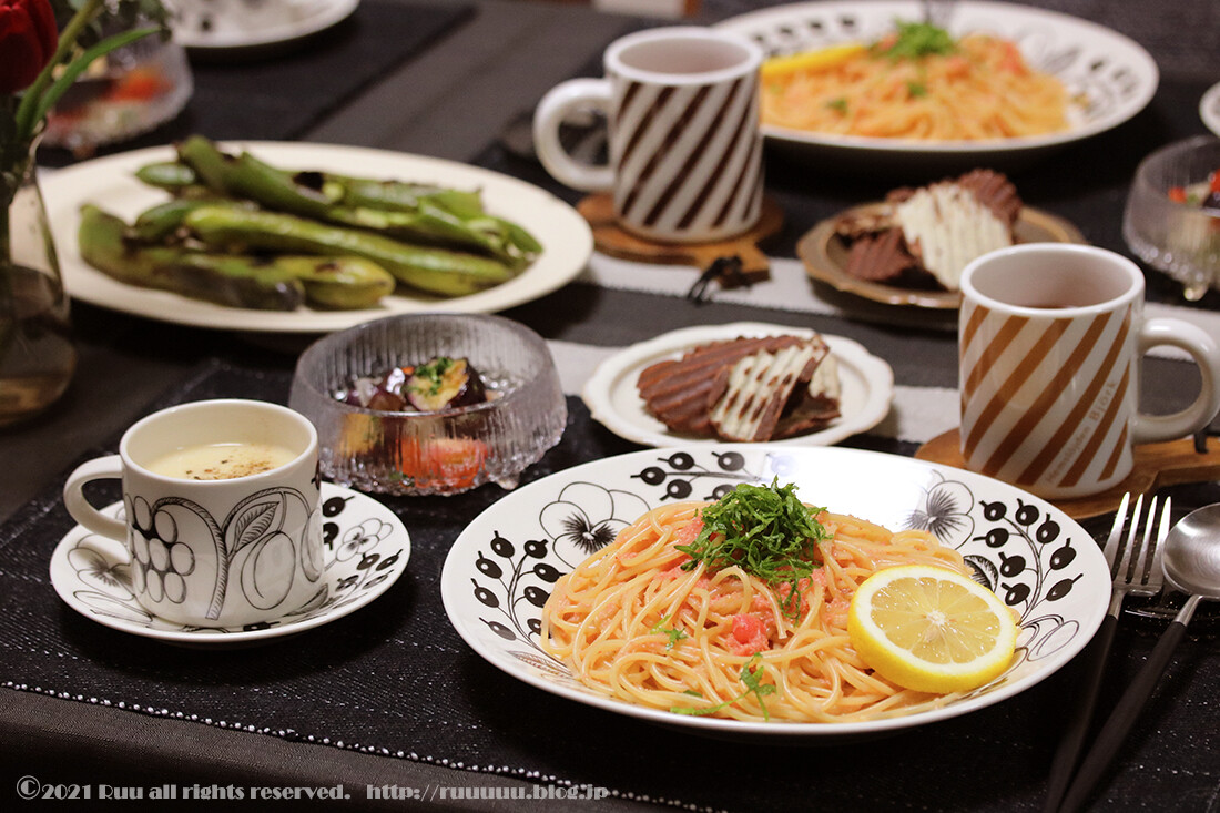 たらこパスタ・焼きそら豆・揚げ茄子とミニトマトのマリネ・じゃがいものポタージュ・それはそれは楽しみにしてたロイズのポテトチップ