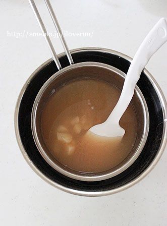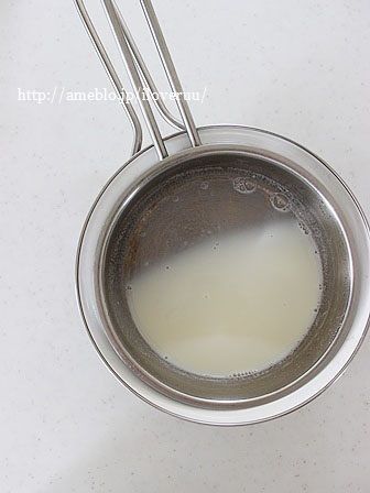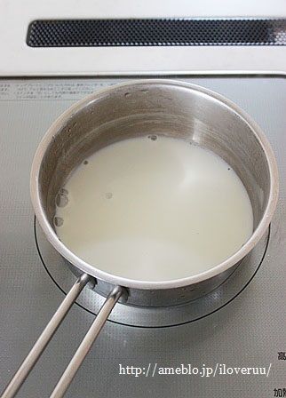 7:小鍋に牛乳、練乳を入れて火にかけ、ふつふつっとしたら火を止め、1のゼラチンを加え、溶かす。