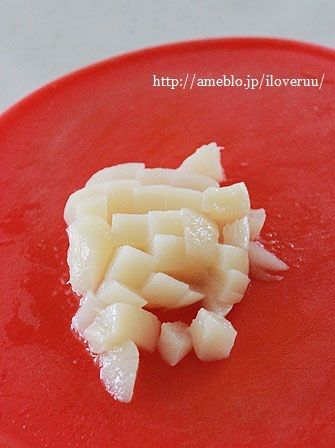 ここでとろみをつけないと、角切りの桃が全部沈んじゃうので、角切りの桃が浮くくらいまでとろみを。