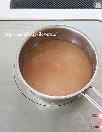 3:小鍋に桃のピューレ、桃缶シロップ、水、砂糖を入れ、火にかける。
