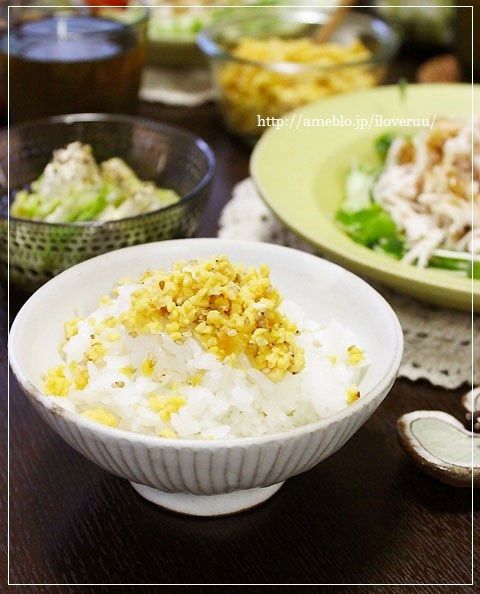 3:フライパンにサラダ油を熱し、2の卵を炒り、炒り胡麻を入れる。