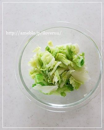 1:キャベツは一口大に切り、ポリ袋に入れ、800wのレンジで2分ほどチン!
