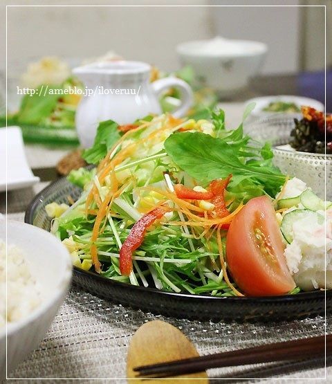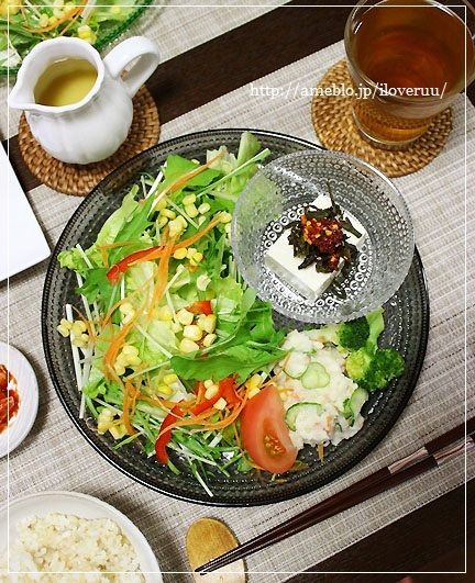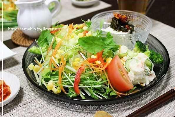 サラダの隣に添えたポテトサラダ達が結構頑張ってくれてますんで、(ポテトサラダだけで120gは野菜がとれてます)