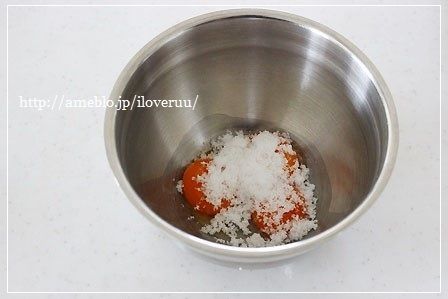 卵黄生地を作るボウルは後にメレンゲを混ぜることを踏まえて、ちょっと大き目のものを使ってください。