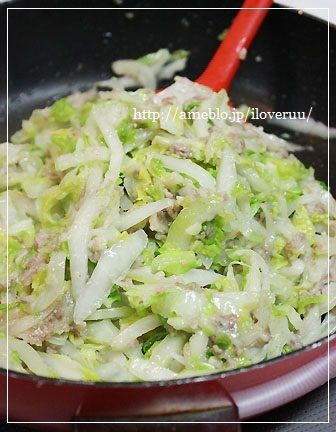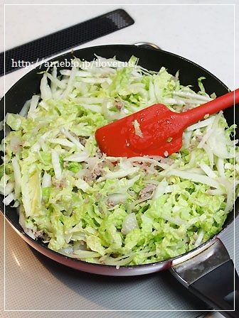 フライパンから溢れんほどの白菜だけど、2~3分も炒めればぺっしゃんこになりますんで。