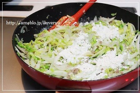 3:白菜がしんなりしたら、小麦粉を入れ、さらに炒める。
