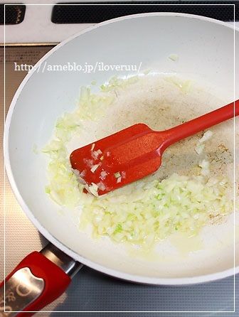 4:フライパンにバターとみじん切りのにんにくを入れて火にかけ、香りがでたら、玉ねぎを炒める。