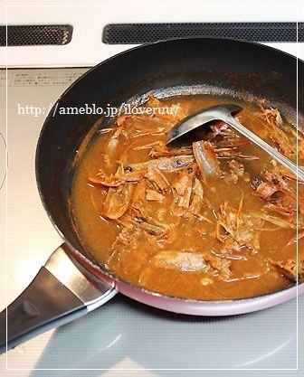 海老の頭と殻は、海老を焼いたフライパンに戻す感じで。