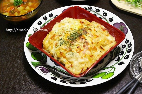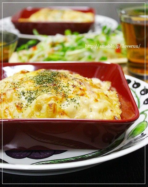 玉ねぎとマカロニくらいしか入ってない貧乏ドリアですが、