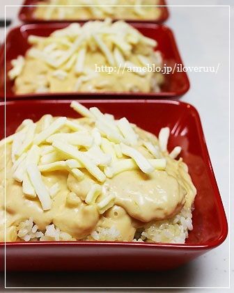 6:耐熱皿に5のピラフを入れ、たっぷりと3のソースをかけ、とろけるチーズをのせる。