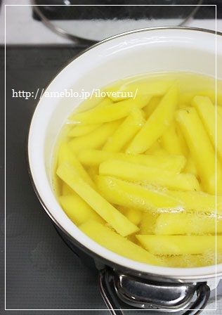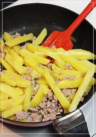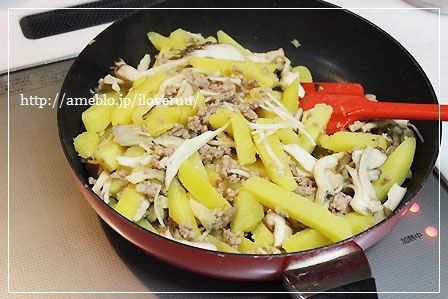 じゃがいもは、ちょっと焼き色がつくくらいまで炒めるとオイシー。火加減は最初から最後まで強火。