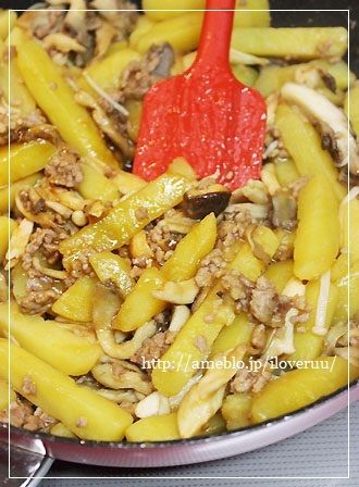 じゃがいもときのこのオイスターそぼろ炒めできあがり♡
