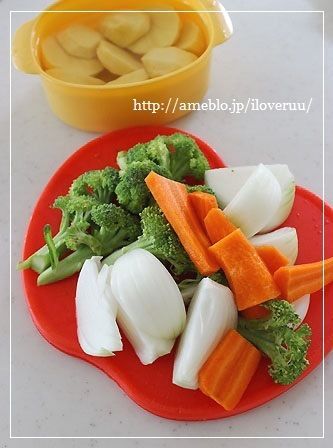 人参、ブロッコリーは食べやすい大きさに、玉ねぎはくし切りにする。