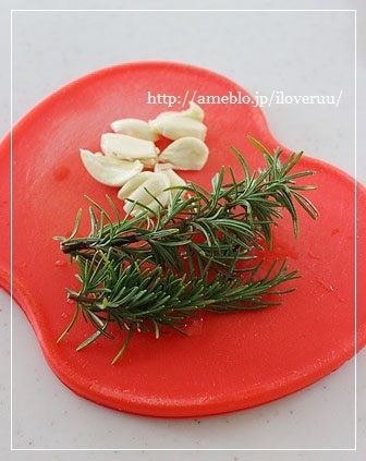 ローズマリーとにんにくは、肉と一緒に漬けてたものをそのまま使います。