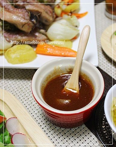 肉汁1に対して、ケチャップ2、とんかつソース2、そこにお好みでお砂糖を少々混ぜたものをレンジ(600W)で30秒ほどチン。
