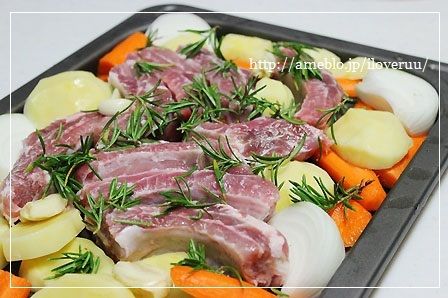 5:3のスペアリブ、4の野菜は共に水気を切り、鉄板に並べ、にんにく、ちぎったローズマリーをのせる。