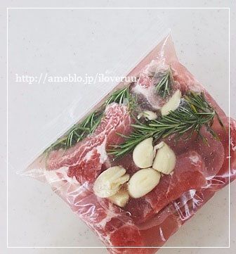 3:●印と1のにんにく、ローズマリーを入れ、空気を抜きながら袋の口をとじ、冷蔵庫で4時間程置く。