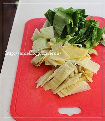 2:筍は食べやすい大きさに、青梗菜も食べやすい大きさに切る。