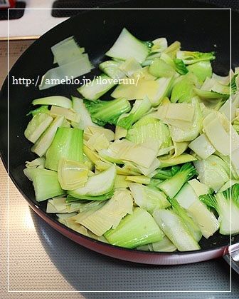 3:フライパンにごま油大さじ1と生姜を入れて火にかけ、香りが出たら、青梗菜の株→筍の順に炒める。