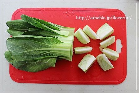 ちなみに、青梗菜は株の部分も食べれるので、株の部分はこうやって切るとよいですわよ。