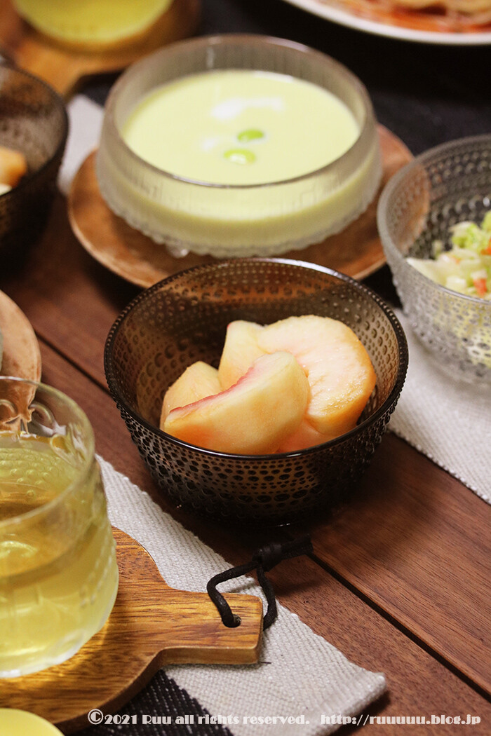 ぶっかけチーズの冷製トマトパスタ・スペアリブと焼き野菜たち・枝豆のポタージュ・コールスローサラダ・桃